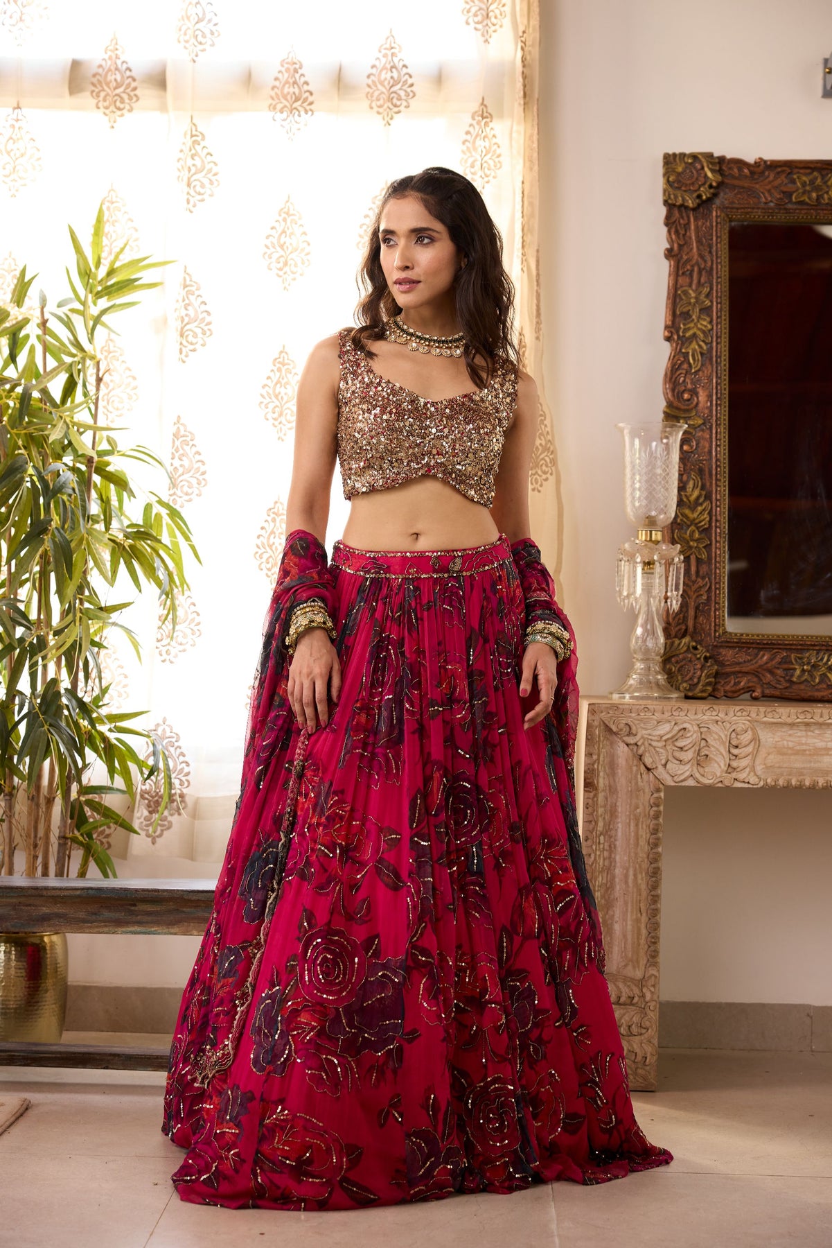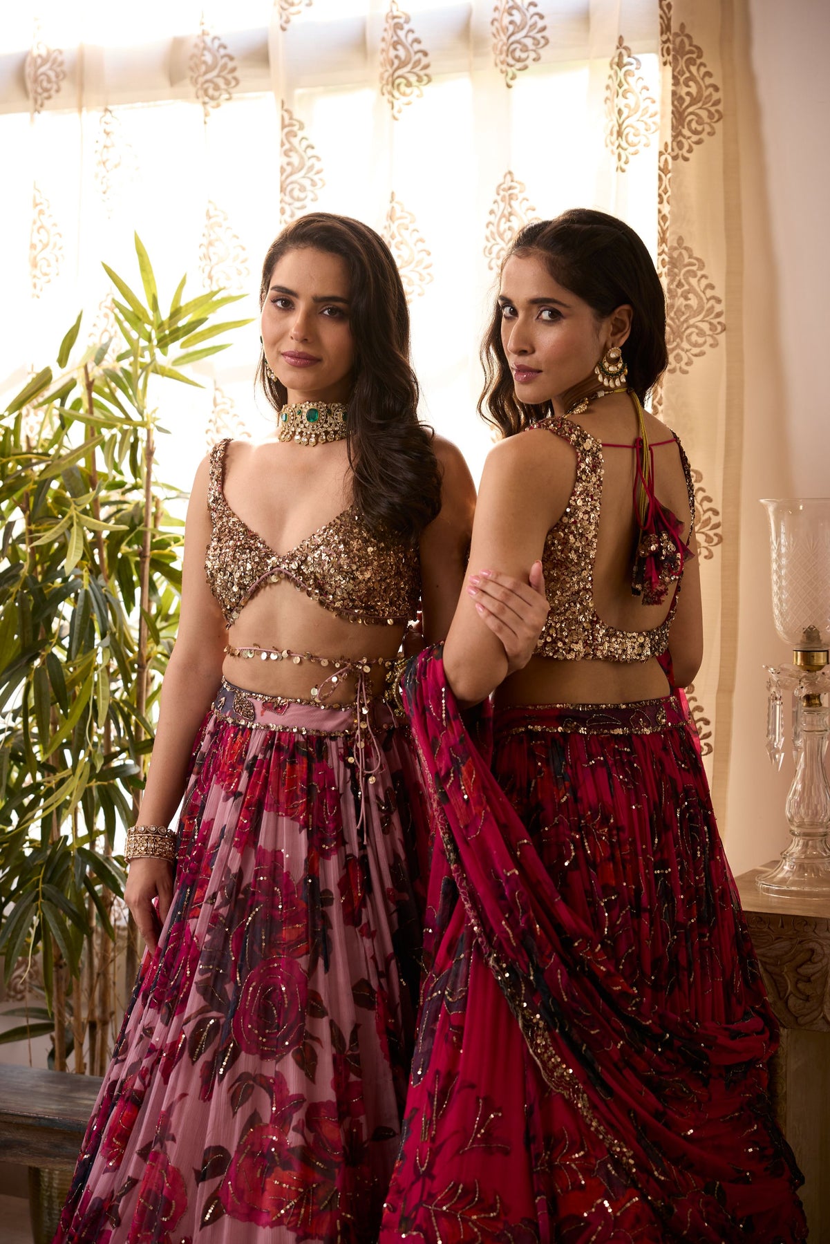 Featuring a Caramine Pink Floral Lehenga in Chiffon.